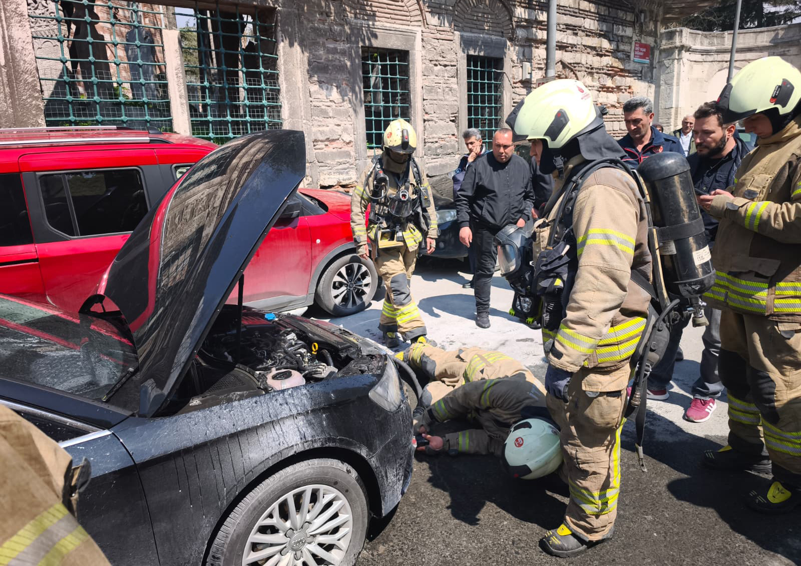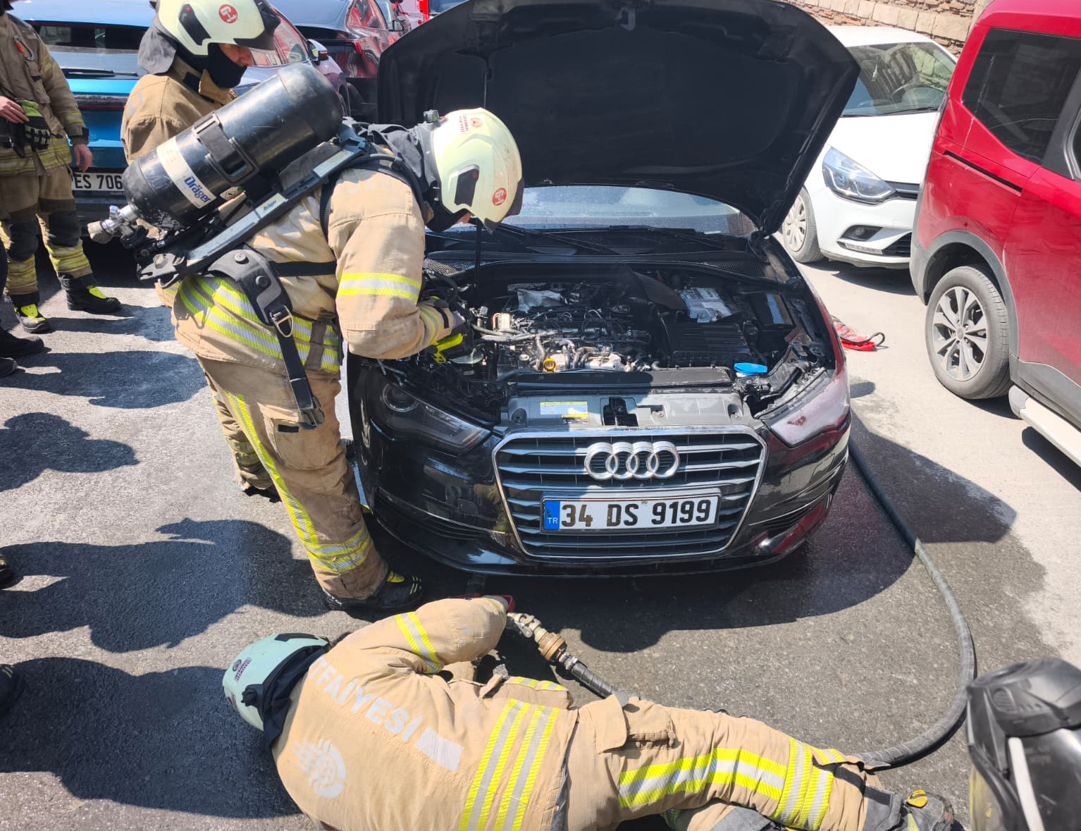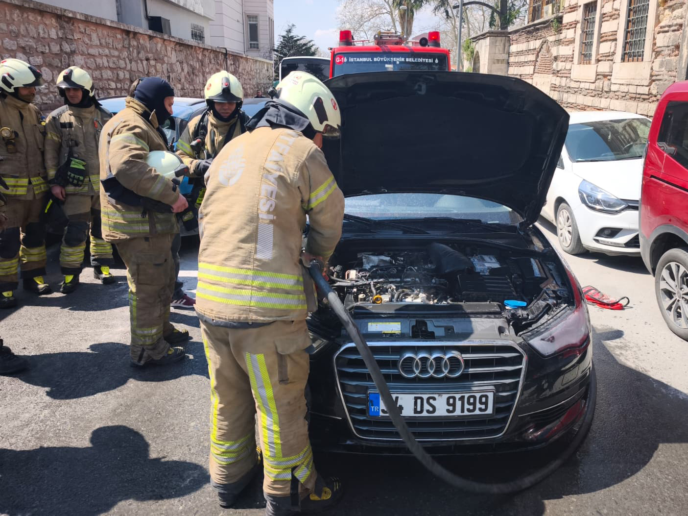 A fire broke out in a parked vehicle on Besim Ömer Paşa Street in Süleymaniye Neighborhood.