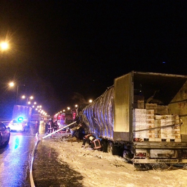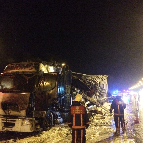 Silivri TEM Otoyolu Kınalı Gişeleri mevki Edirne istikameti seyir halindeki tırda yangın meydana geldi. Saat 00:21 sıralarında alınan ihbarlar üzerine olay yerine İstanbul Büyükşehir Belediyesi İtfaiye Daire Başkanlığı'na bağlı Silivri ve Çanta itfaiye ekiplerimiz sevk edildi. Kısa sürede olay yerine ulaşan ekiplerimizin çalışması sonucu yanan tır söndürüldü.