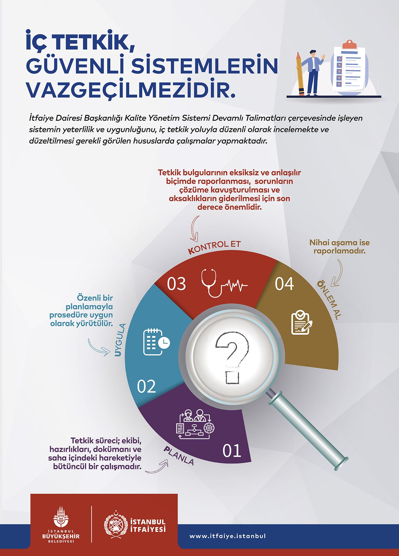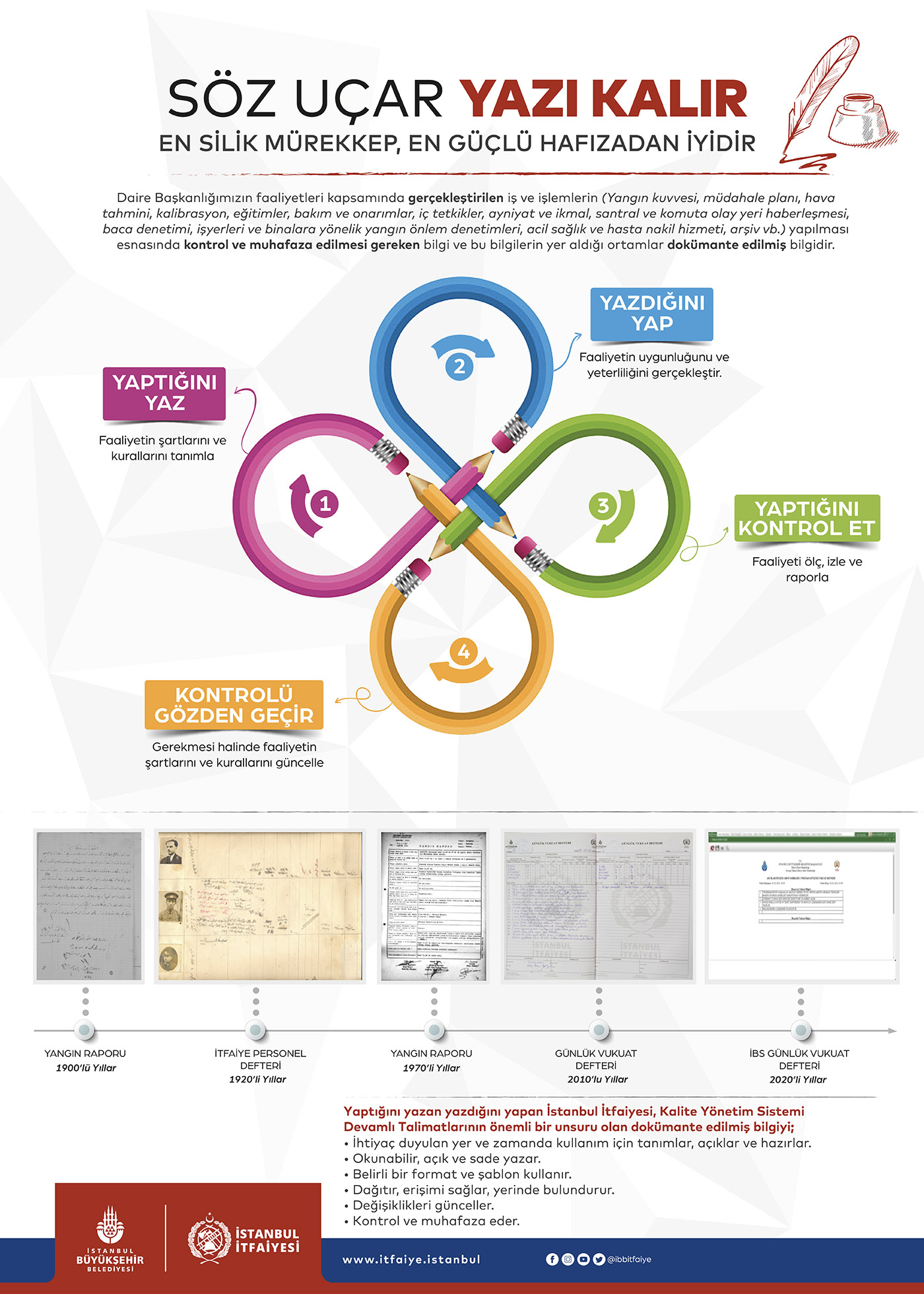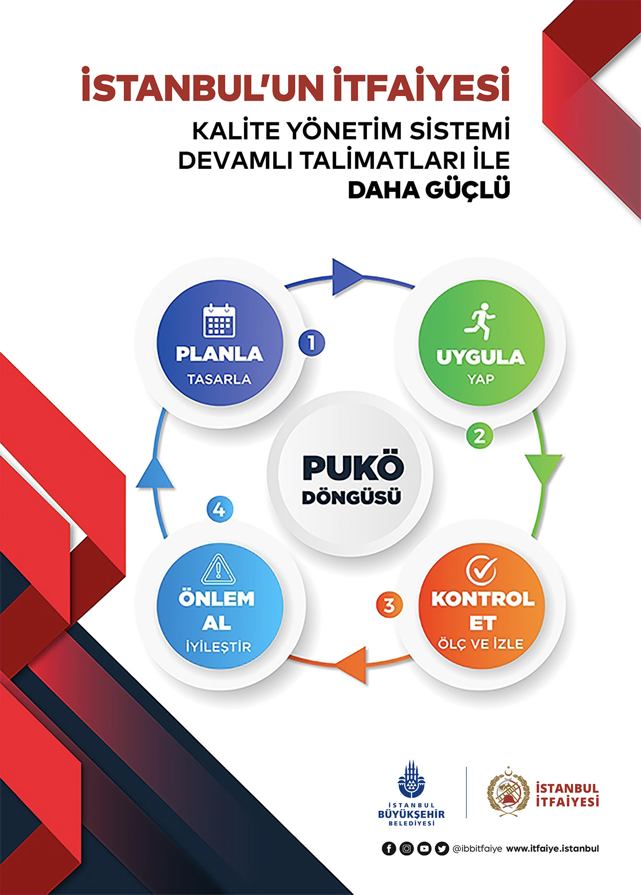 İstanbul İtfaiyesi, gelişen ve değişen hizmet ihtiyaçlarına yönelik vatandaşın beklentilerini karşılamayı, sürekli iyileştirmeyi ve en iyisi olmayı hedefleyerek çıktığı bu yolda, kalite yönetim sistemine ait iş ve işlemleri devamlı talimatları uygulayarak geliştirmekte ve hizmet vermektedir.